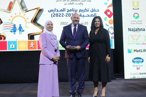 تشرين الثاني 2022 – كرّمت الجمعية الملكية للتوعية الصحية بحضور الأمين العام لوزارة التربية والتعليم للشؤون المالية والإدارية الدكتورة نجوى القبيلات، شركة أمنية لدورها المميز في دعم برنامج المدارس الصحية في كل من محافظتي الزرقاء وإربد، والذي أسهم في تعزيز الممارسات الصحية لدى ما يزيد عن 4,000 طالباً وطالبة وعدداً من المدرسين، وجعل بيئة التعلم في هذه المدارس أكثر صحة وأماناً لهؤلاء الطلبة.