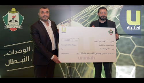 JD65,000 Revenues for Al-Wehdat Club Umniah Offers Al-Wehdat Sports Club Fans the Chance to Support their Team through the ‘”Al Mared Al Akhdar Smart” April 11, 2019 – Amman, Jordan: Umniah, through its strategic partnership with Al-Wehdat Sports Club, offered the club’s fans and followers the chance to accumulate JD65,000 from the revenues of its dedicated ‘Al Mared Al Akhdar Smart’. Umniah signed a strategic agreement with Al-Wehdat Sports Club at the end of 2017, and now provides club members and fans with the Al-Wehdat 7 Smart line, Al-Wehdat 12 Smart line, and Al-Wehdat 5 Smart line, with a portion of the revenues from the sales of these packages going to support the athletic club and its efforts in the sports sector. At a press conference held on the occasion, Umniah CEO Ziad Shatara presented Al-Wehdat Sports Club President Yusuf Al-Sugur with a check for JD65,000. The strategic cooperation between Umniah and Al-Wehdat Sports Club is directly in line with Umniah’s strategy to offer its continuous support to sports and the country’s youth. Speaking at the press conference, Shatara said, “Today we highlight the outstanding results of our partnership with the Al-Wehdat Sports Club, as well as the company’s efforts, through its innovative products and services, to positively contribute to supporting the club’s activities. We look forward to continuing this productive cooperation in future.” Shatara went on to add that he values Al-Wehdat Sports Club’s positive effect on sports in the country, particularly in football, through which the club enjoys a wide and hugely popular base. Also at the press conference, Al-Sugur said that he considers the club’s partnership with Umniah a positive example of the private sector’s role in supporting Jordanian sports. Al-Sugur went on to say that he hopes that the club’s partnership with Umniah will widen in scope to the benefit of both organizations. He added that Umniah is a pioneering company and a model for the private sector in social contributions, offering the best business solutions and outstanding products. Umniah’s range of packages provide Al-Wehdat Sports Club’s fans and followers with an opportunity to receive outstanding offers both through Umniah’s network or local and international calls, as well as text messaging and high-quality Internet services. They also offer the opportunity to support the club and its activities, with a portion of the revenues advancing the club’s efforts in the field of Jordanian sports. – End-