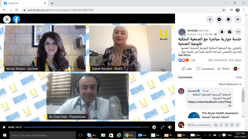 Pediatrician and pediatric critical care consultant Dr. Firas Rabi discussed the importance of creating a healthy routine for children in view of distance learning during the session, which was moderated by Umniah CSR & Innovation Manager Nicole Shahin. Also at the session, RHAS Program Coordinator Suhair Barakat examined the Healthy Schools Program’s role in improving the health of children, particularly during the coronavirus pandemic.